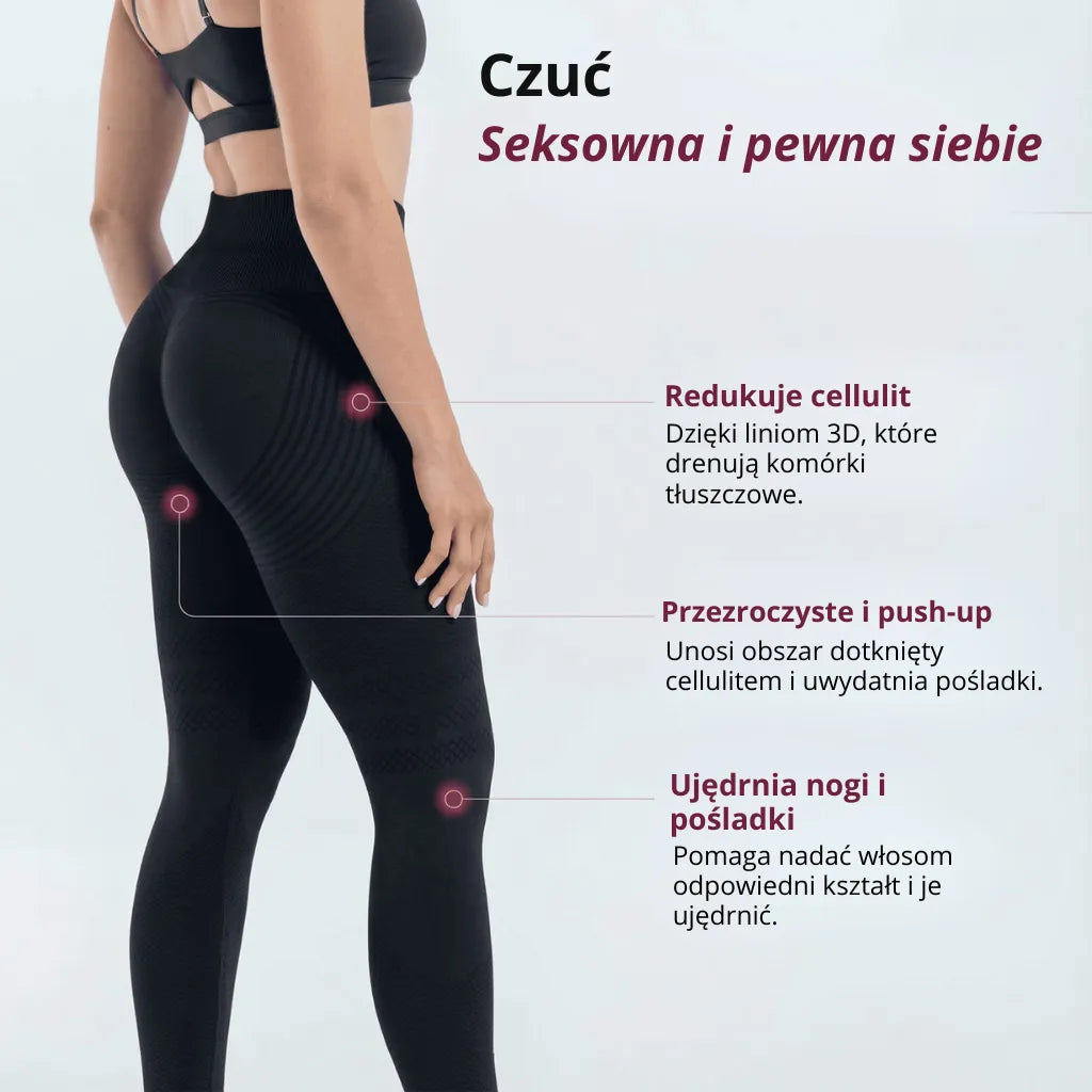 Dzięki technologii drenażu 3D nasze legginsy stymulują krążenie krwi przy każdym ruchu, pomagając organizmowi naturalnie redukować cellulit.